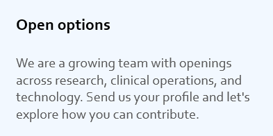We are always looking for passionate professionals who want to make a difference in healthcare. Whether you are a researcher, clinician, or data specialist, you'll find opportunities to grow and contribute to meaningful work.